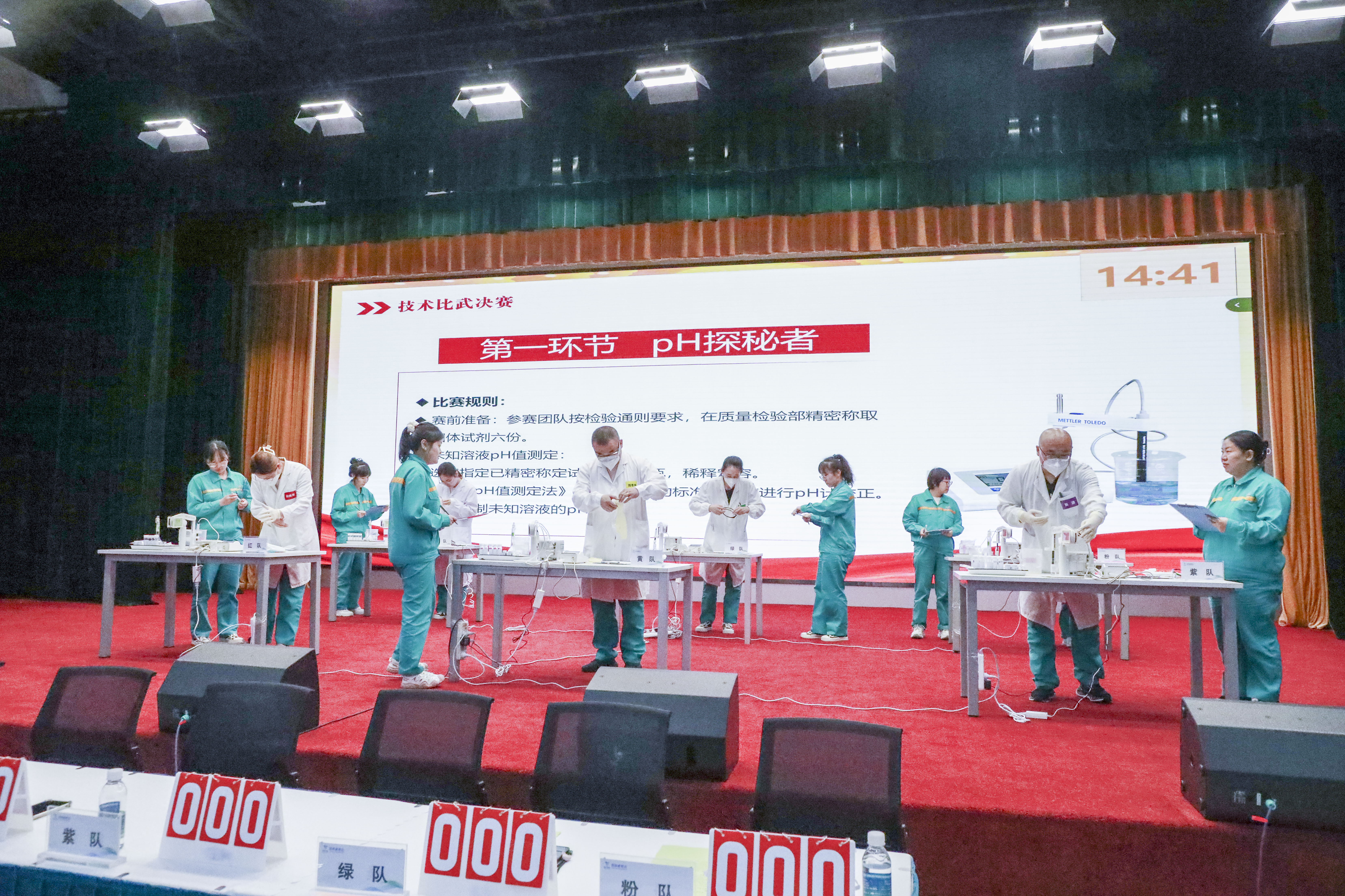 “质量杯”技能比武将化学分析的理论知识、实操能力与赛事趣味性深度融合,充分彰显“以数据说话,用精准论英雄”的质量文化。“pH探秘者”环节中,选手面对盲样从容操作,精准把控仪器与测量要点;“精准论英雄”环节,选手以嘉宾现场预设体积完成移液加标,再经液相色谱仪测定计算,展现从操作到数据处理的全面功底;“火眼巡防”则考验团队协作与逻辑思维,快速识别违规操作与安全隐患,体现质量管控的“火眼金睛”。