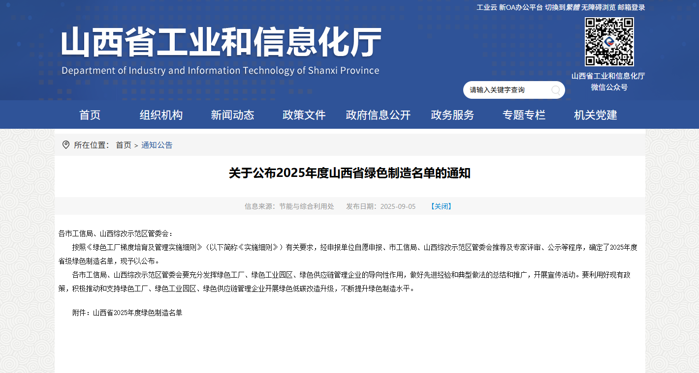 近日,山西省工业和信息化厅公布山西省2025年度绿色制造名单,国药威奇达成功上榜,成为山西省“绿色供应链管理企业”。