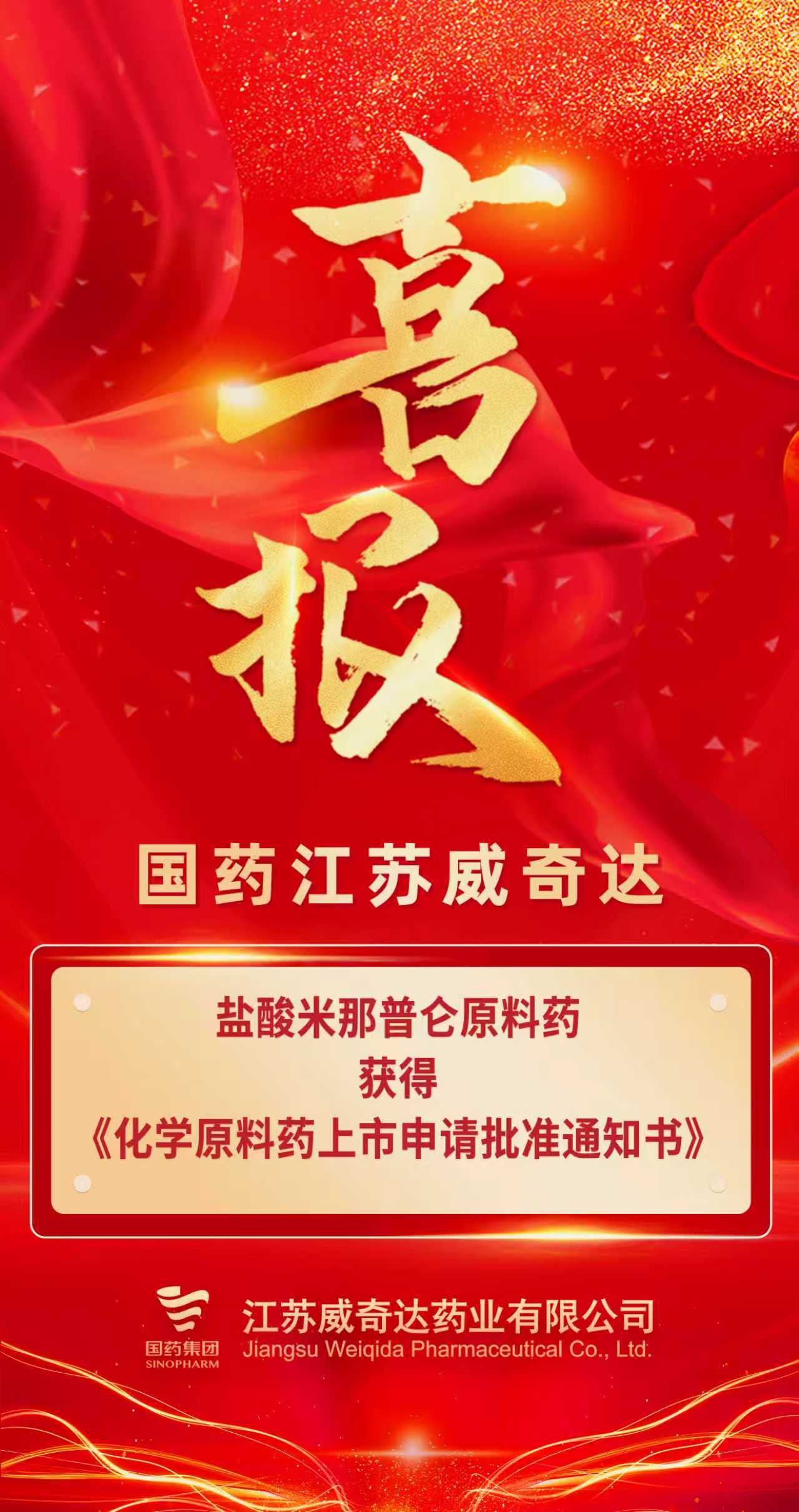 近日,子公司国药江苏威奇达收到国家药品监督管理局核准签发的《化学原料药上市申请批准通知书》,批准盐酸米那普仑原料药上市申请。