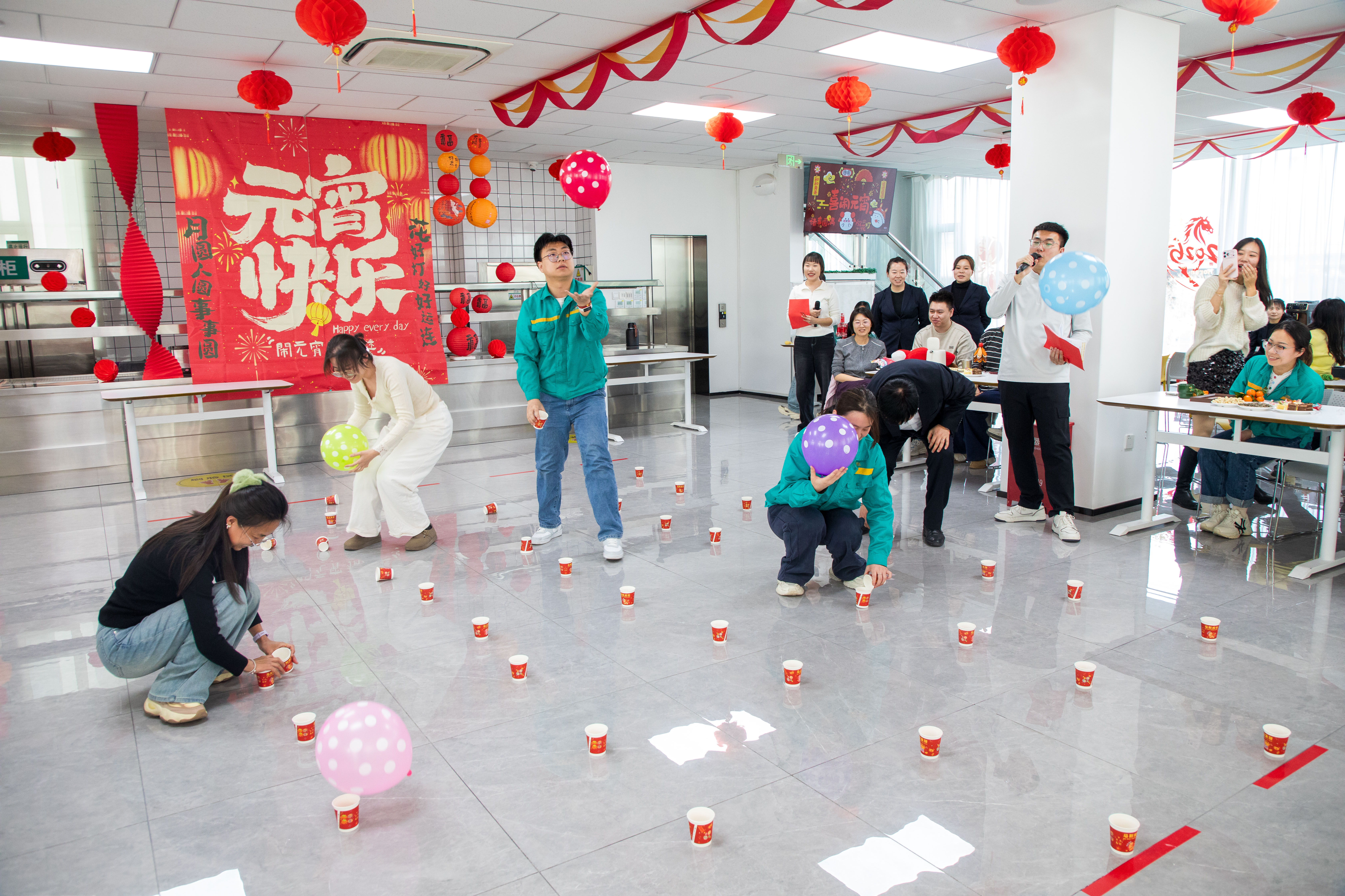 在研究中心会场,“元宵快乐”绘布高高挂起,灯笼彩带悬挂屋顶,营造出浓浓的节日氛围。活动一开场,“巧手制花灯”环节就率先点燃热情!大家围坐在一起,穿线、粘贴、装饰,指尖翻飞间,一盏盏造型各异的花灯逐渐成型。游戏环节更是活力满满,“策马扬鞭闹元宵”“喜乐团圆踏福来”“团团圆圆大搬运”“一击即中沾福气”四个游戏依次进行,灯谜竞猜穿插其间,现场加油声、欢笑声此起彼伏,每一轮比拼都充满惊喜,每一份参与都承载欢乐。活动尾声,大家共同展示亲手制作的花灯、共享暖心元宵,将团圆与祝福融入舌尖,收获满满的喜悦与福气。