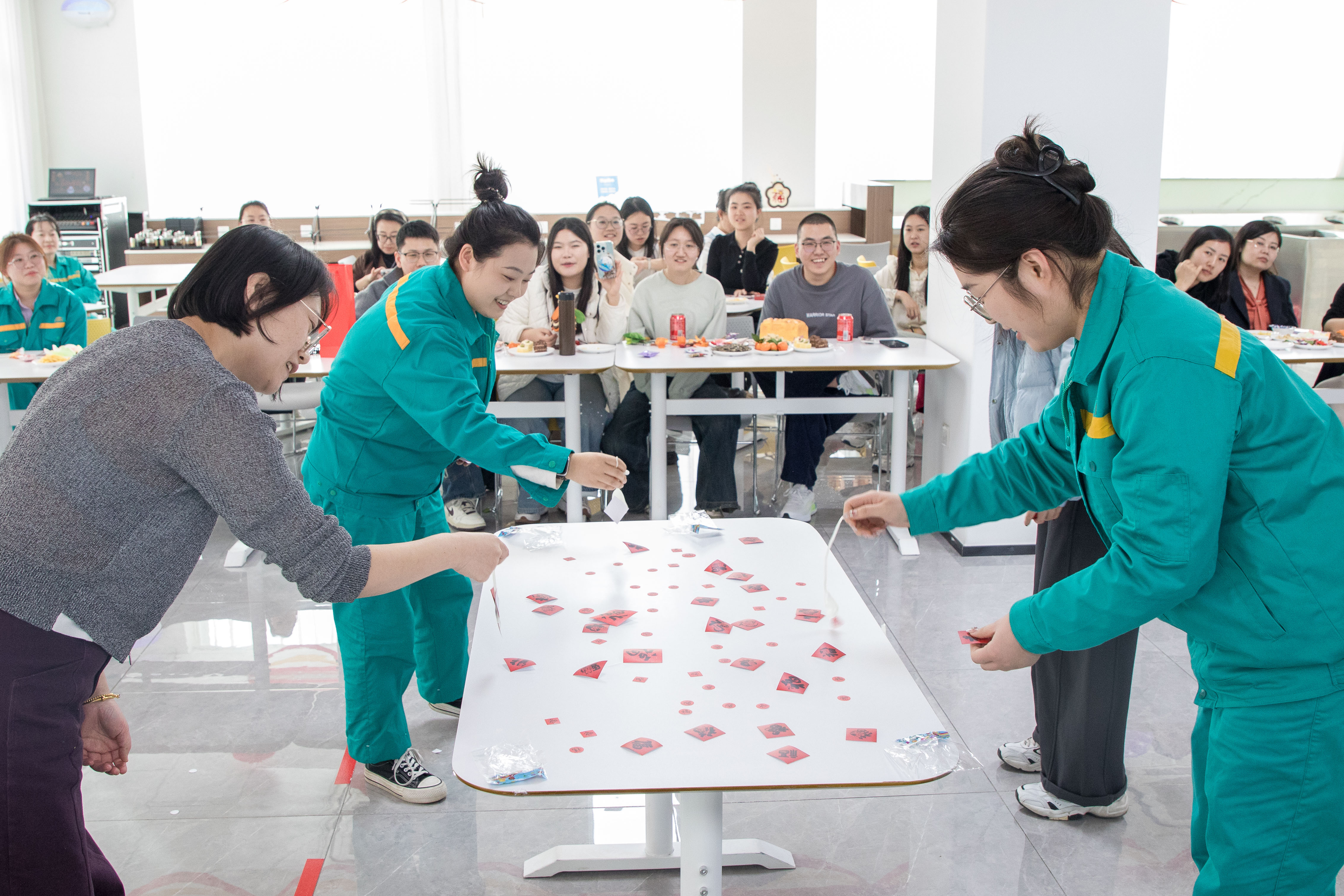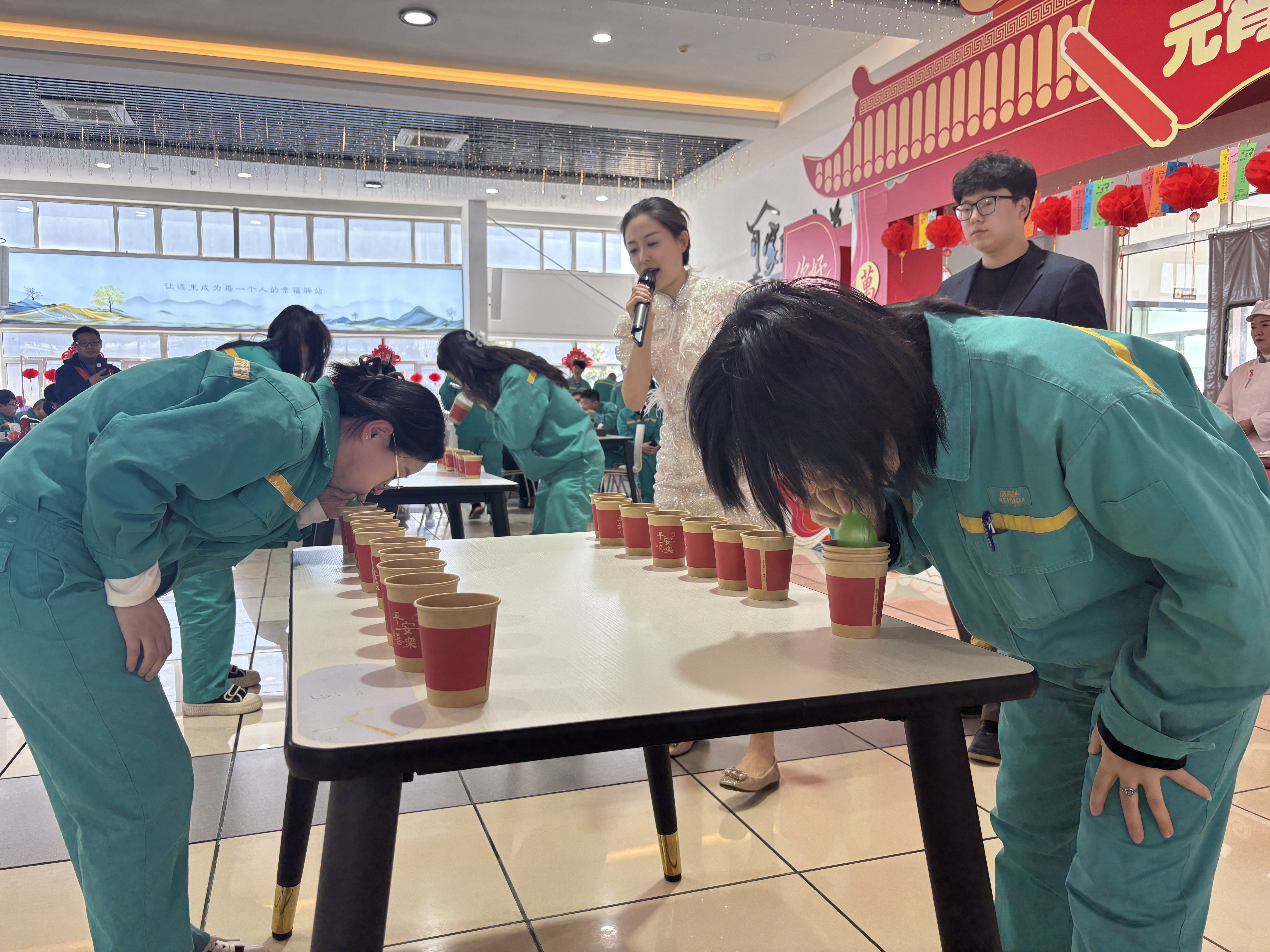 在头孢事业部会场,600余条灯谜悬挂两侧,“节节高升”“夹纸运杯”“嘟嘟小嘴”“眼疾手快”“投壶”“抢凳子”六大游戏轮番上阵。大家踊跃举手参与,争相解锁趣味挑战。看“节节高升”现场,选手弯腰俯身、口含气球,快速吹气夹起纸杯,每叠起一层都引来阵阵喝彩;“夹纸运杯”环节,选手头顶纸杯、腿夹白纸,一步一稳的模样逗得全场捧腹;“嘟嘟小嘴”里,选手嘟嘴夹着筷子,屏气凝神专注传递,考验专注力的同时满是欢乐;“眼疾手快”环节,选手屏气凝神,稳稳将随机掉落的福气骨棒“一手掌握”;“抢凳子”则将全场气氛推至高潮,大家在音乐戛然而止的瞬间抢先入座,解锁新一年的奋进元气。